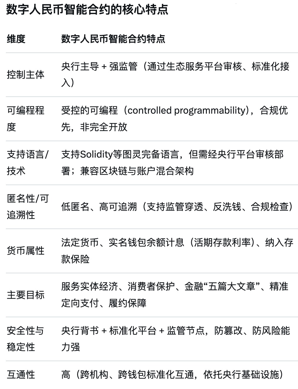 Caixinによると、デジタル人民元は制限付きチューリング完全な設計を採用しており、中央銀行が許可したテンプレート化されたスクリプトのみをサポートしています。この設計は特定の機能を制限する一方で、システムのセキュリティと制御性を効果的に確保します。暗号通貨業界の完全チューリング完全なスマートコントラクトと比較して、デジタル人民元のこの設計は、脆弱性、攻撃、ガバナンスの失敗など、スマートコントラクトに共通するリスクを回避します。注目すべきは、デジタル人民元スマートコントラクトの開発は、Ethereumと互換性のあるSolidityのような完全チューリング完全な言語を含む複数のプログラミング言語をサポートしているため、その発展の可能性は無限大であるということです。