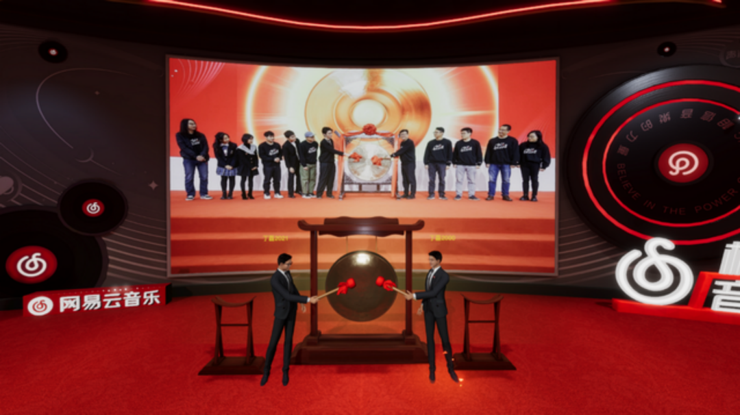 但另一邊熱鬧的是,網易借助網易云上市秀了一把元宇宙,玩起了“雲敲鐘”。除了線下敲鐘儀式之外,丁磊通過網易伏羲沉浸式活動系統“瑤台”,舉辦了全球首個“元宇宙”上市儀式。