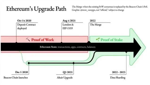 在合併之前,也就是目前這個階段,以太坊處於PoW+PoS平行運行的階段。提前啟用PoS平行鍊鍊主要是出於兩方面考慮,第一是盡量減少對目前運行的PoW鏈的影響,減少共識轉換對網絡帶來的衝擊,第二是給新的PoS網絡足夠的時間收集質押的ETH,以保證網絡安全運行。