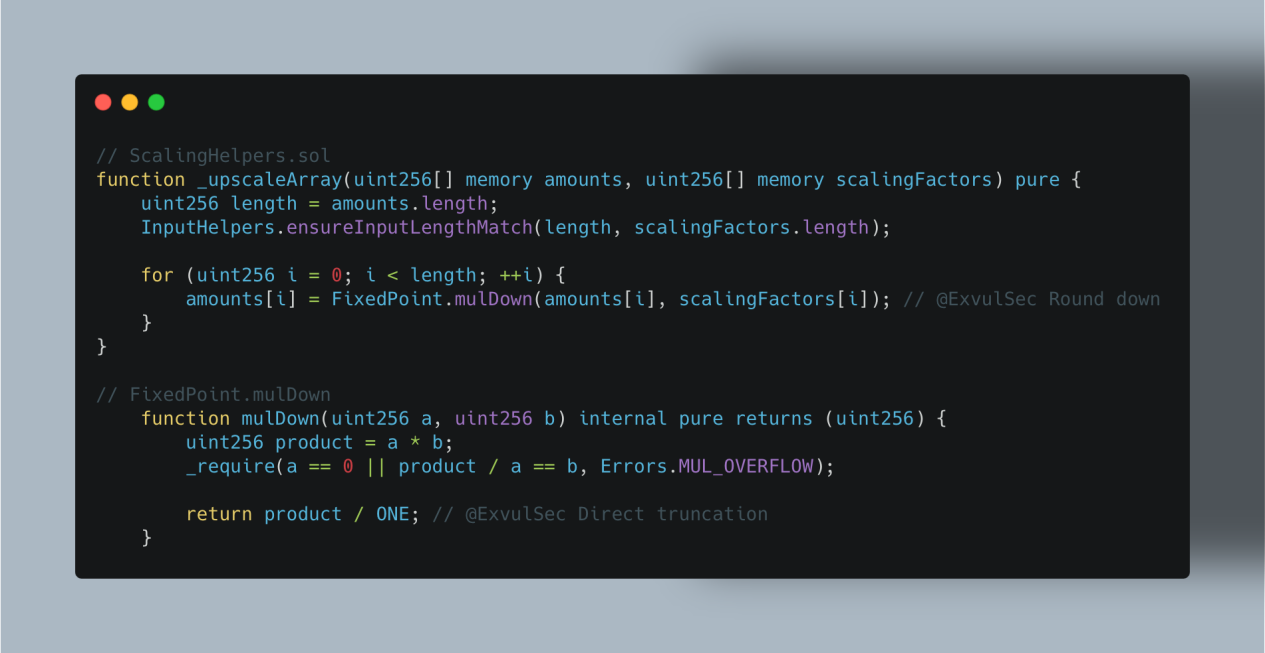 本次攻击的关键问题出在协议处理小额交易的逻辑上。当用户进行小金额交换时,协议会调用_upscaleArray函数,该函数使用mulDown进行数值向下舍入。一旦交易中的余额与输入金额同时处于特定舍入边界(例如 8-9 wei 区间),就会产生明显的相对精度误差。