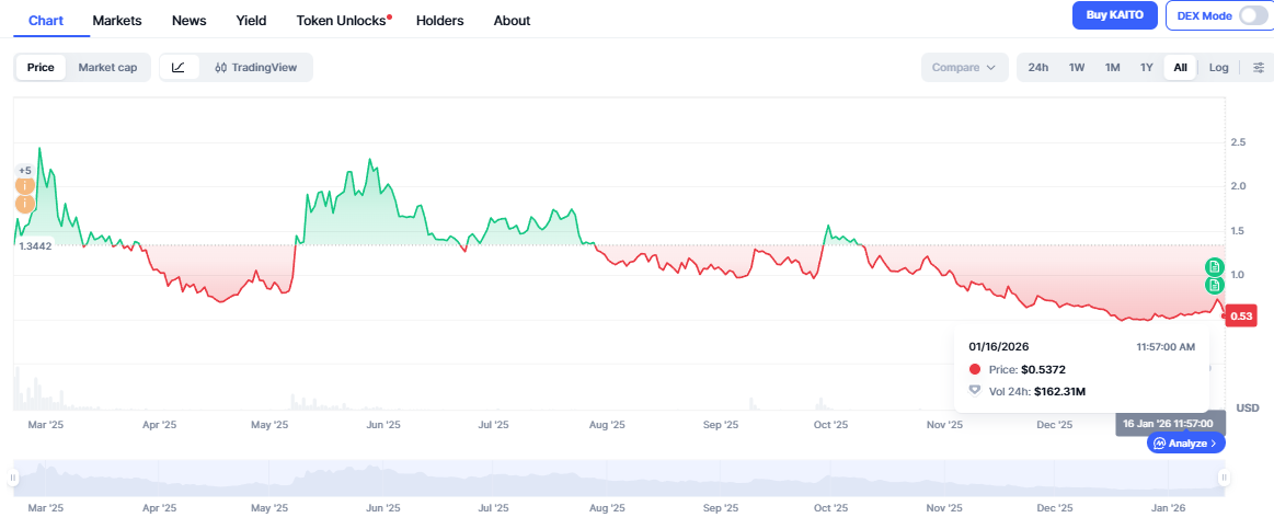 KAITO 的价格表现反映出市场对该赛道风险结构的重新定价。当前 KAITO 价格较 2025 年 2 月约 2.88 美元的历史高点 已下跌 超过 80%,意味着投资者已不再愿意为“社交互动即价值”的叙事支付溢价。