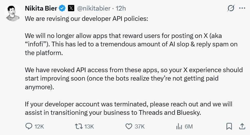 2026 年 1 月 15 日,X(原 Twitter)对其开发者 API 政策进行了实质性调整,明确撤销了对通过代币激励用户发帖或互动的应用程序的 API 访问权限。这类项目在加密领域通常被统称为“InfoFi”。X 产品负责人 Nikita Bier 在公开表态中表示,此举旨在遏制平台上日益泛滥的“AI 垃圾内容与回复刷屏”现象——激励式发帖机制在短时间内放大了低质量、自动化内容,显著损害了用户体验。