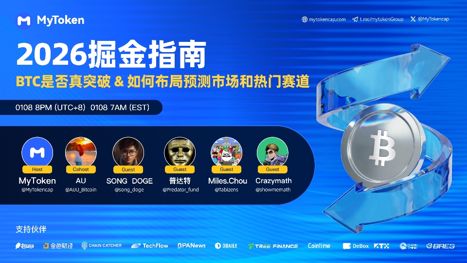 近日,知名区块链数据平台MyToken举办了一场主题为“2026掘金指南 – BTC是否真突破 & 预测市场和热门赛道如何布局”的线上AMA,本期嘉宾阵容豪华,围绕2026开年的市场行情、潜在风险与热门赛道展开了深度激辩。