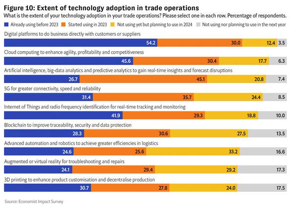 - 科技转型:高管们坚信科技将是全球贸易未来的驱动力。从库存管理到优化运输路线,98% 受访高管们已经利用人工智能 (AI) 来提升供应链运营