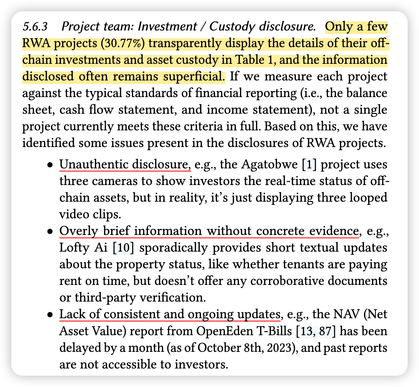 RWA 最大的黑箱在于链上资产是否真的对应链下实物。很多项目所谓的信息披露,只是在网页上挂几个 PDF 文件,甚至出现过用循环播放的录像冒充实时监控的荒唐案例。OpenEden 的资产净值报告也曾经出现滞后了一个月的情况。