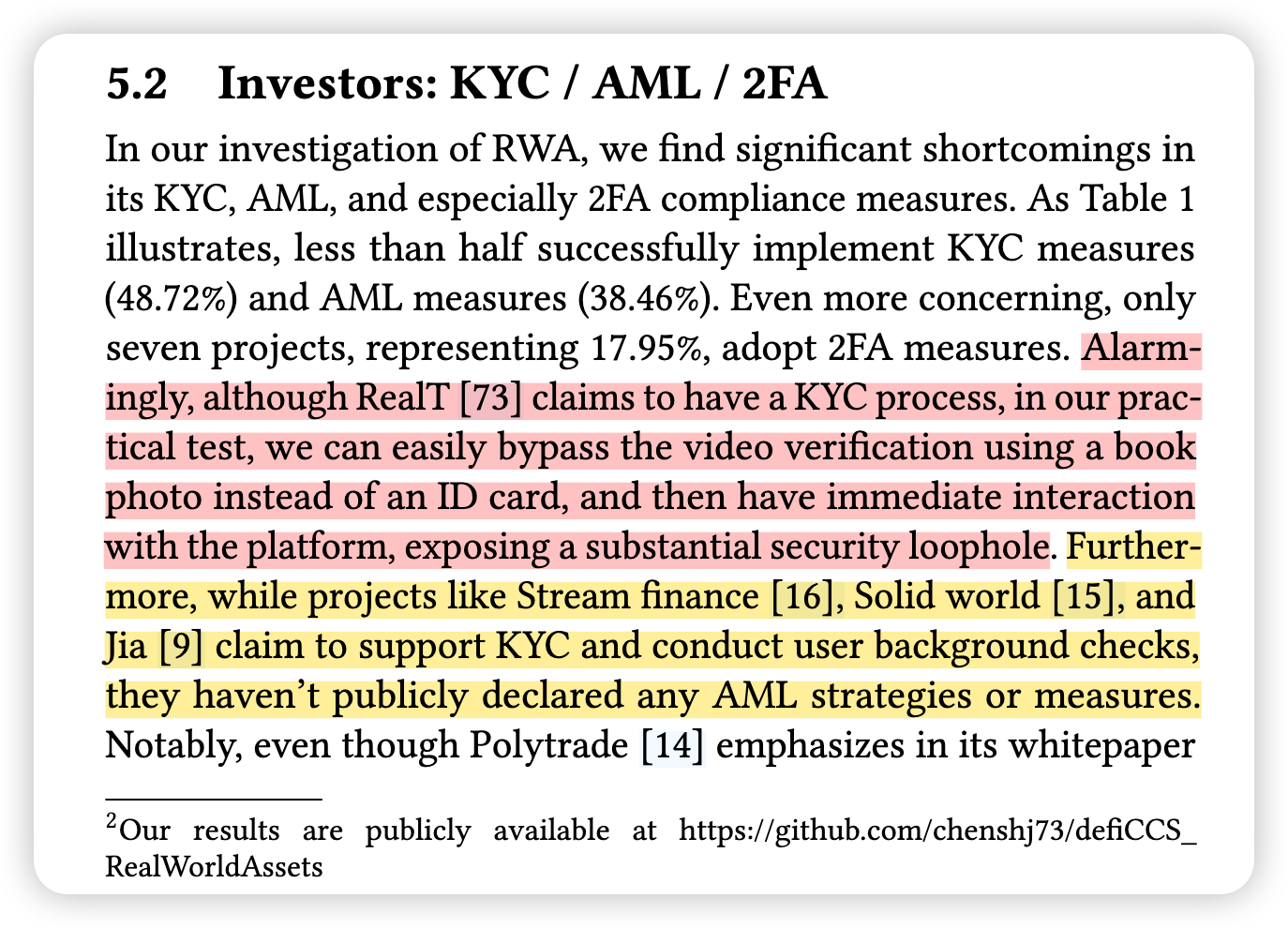 项目声称合规,实则流于形式。据统计,仅有不到一半的项目实施了有效的 KYC,甚至有知名项目(如 RealT)的视频验证环节曾出现可以用一张照片轻松骗过。部分项目虽然在白皮书中强调 AML,实际操作中却只需连接钱包即可交易,完全无法追踪资金来源。