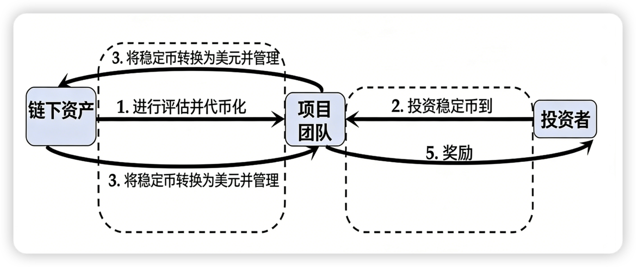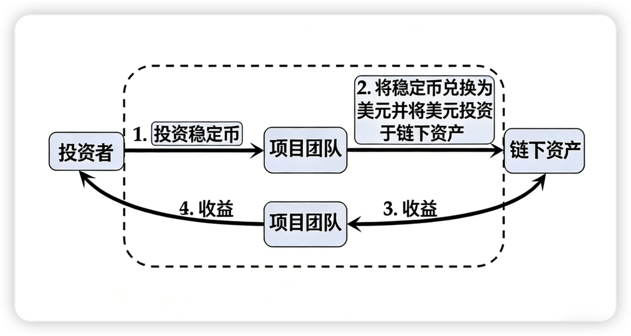 这是目前最常见的模式,本质是链上集资,链下理财。投资者在链上质押稳定币(如 USDC)→ 项目方归集后兑换为法币(USD)→ 投资于链下高流动性资产(如美国国债)→ 获得的利息收益回流链上,分发给代币持有者。