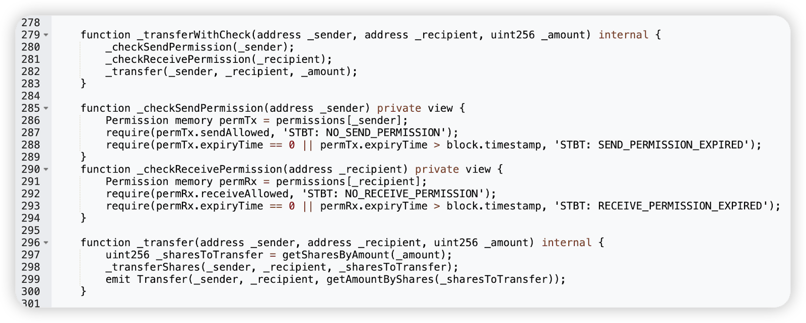• 不要只在网页前端做身份检查。必须在智能合约层集成白名单机制,确保只有通过 DID(去中心化身份)或链下 KYC 验证的地址才能调用 mint 或 transfer 函数。以$STBT 为例,重写 ERC-20 的 transfer 和 transferFrom 函数,只有受认证的白名单才能调用。