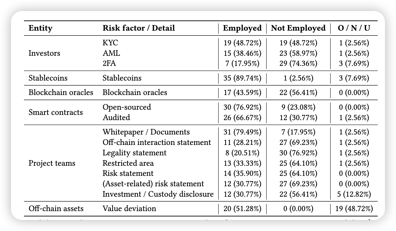稳定币是 RWA 的血液,近 90% 的项目依赖稳定币做结算。但开发者往往忽略了稳定币自身的脱钩风险,如 SVB 事件导致的 USDC 脱钩又或者 USDe 等脱钩风险[2]。如果脱钩发生,项目是否有专门的风险储备金来处理危机?