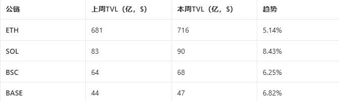 本周四大公链 TVL 均实现环比增长,SOL 链以 8.43% 的涨幅领跑,ETH 链 TVL 增至 716 亿美元,涨幅 5.14%,公链生态整体稳健发展。
