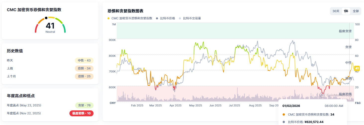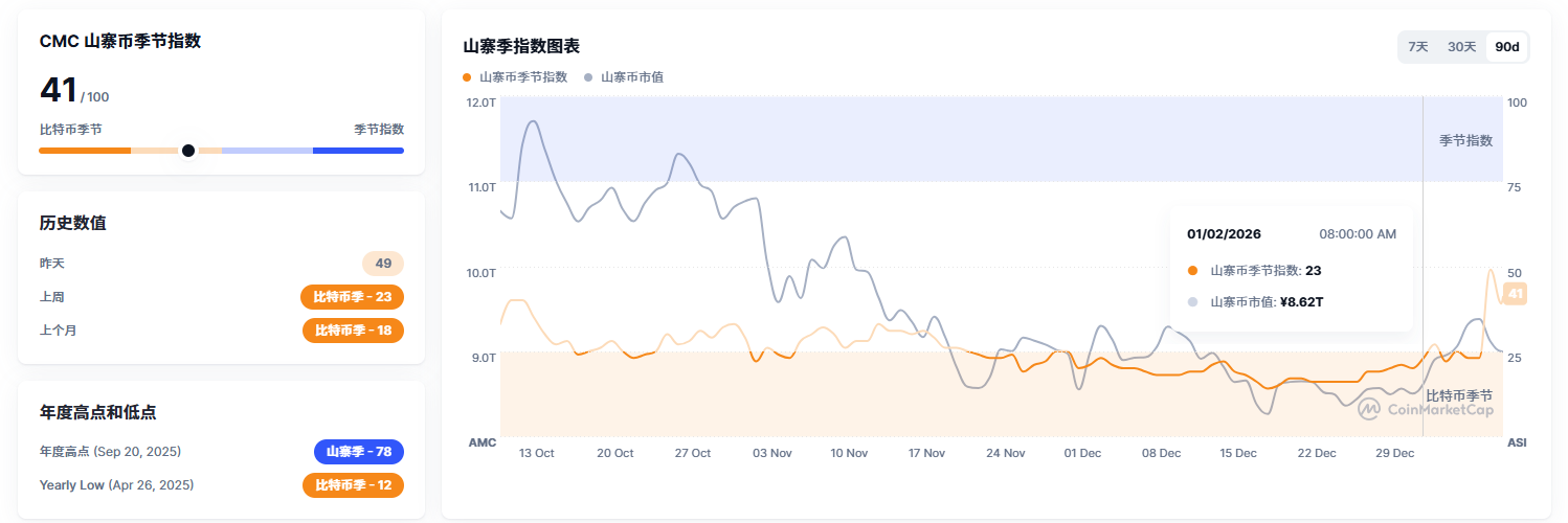 • 山寨指数升至 41,市场交易活跃度大幅提升;情绪指数同步升至 41,进入中性区间,轮动机会值得期待。