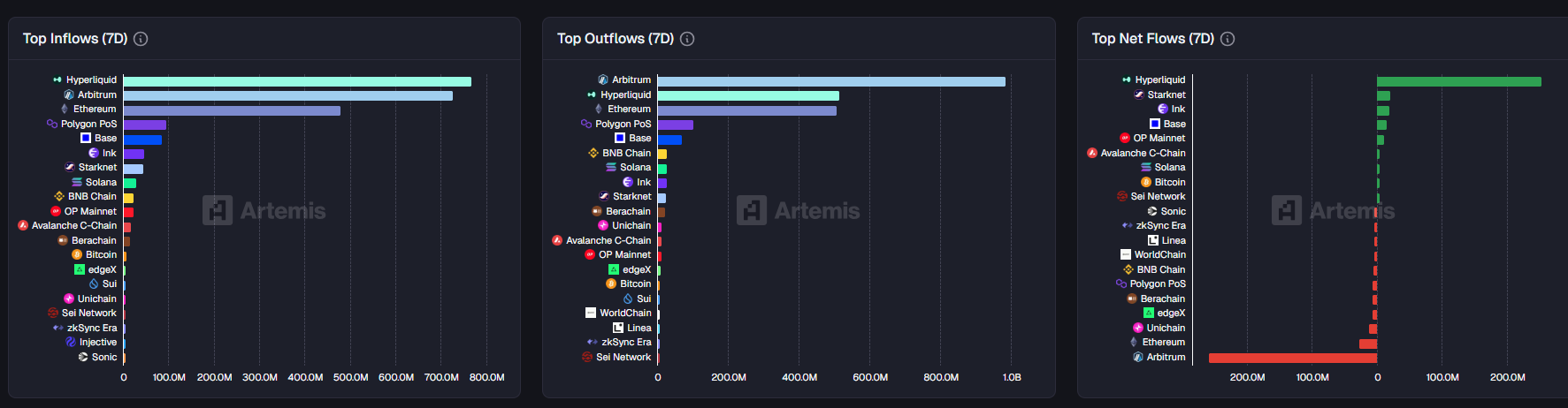 • 资产流向:DeFi 桥接资产净流入最多为 Hype 链,流出最多为 Arb 链,Hype 链合约资金活跃度显著提升,市场情绪边际改善。