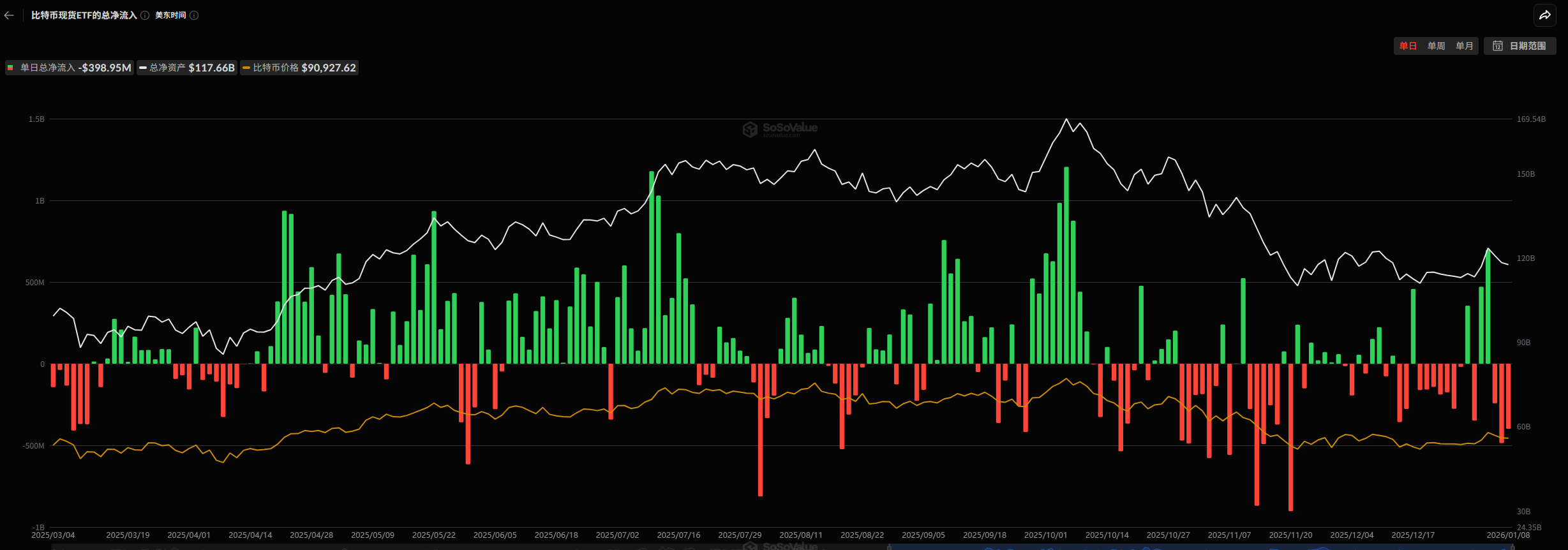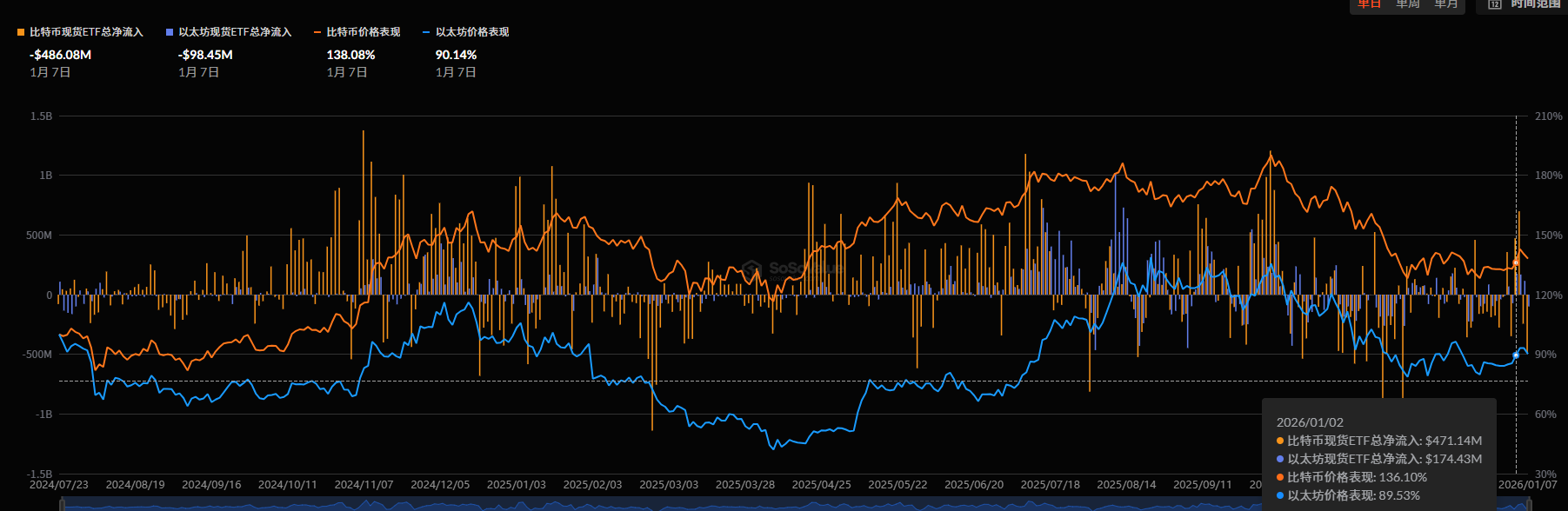 近两周 BTC ETF 净流出 2.4813 亿美元,相较于前一周 6.6437 亿美元的净流出规模明显收窄。资金流出放缓主要得益于 1 月第一周连续三天的大额净流入,同期 BTC 价格同步反弹;但后续 ETF 资金再度出现单日大额净流出,BTC 价格随之回落调整。BTC 短期走势能否企稳,需关注 ETF 资金是否回归持续性净流入。