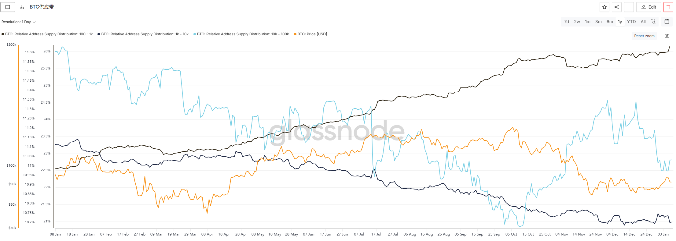 • 持币地址变化:100-1K BTC 地址持币占比从 25.886% 升至 26.162%,增持迹象明显;10K-100K BTC 地址持币占比从 11.341% 回落至 10.972%,延续减持趋势;1K-10K BTC 地址持币占比小幅震荡,暂无明确方向。