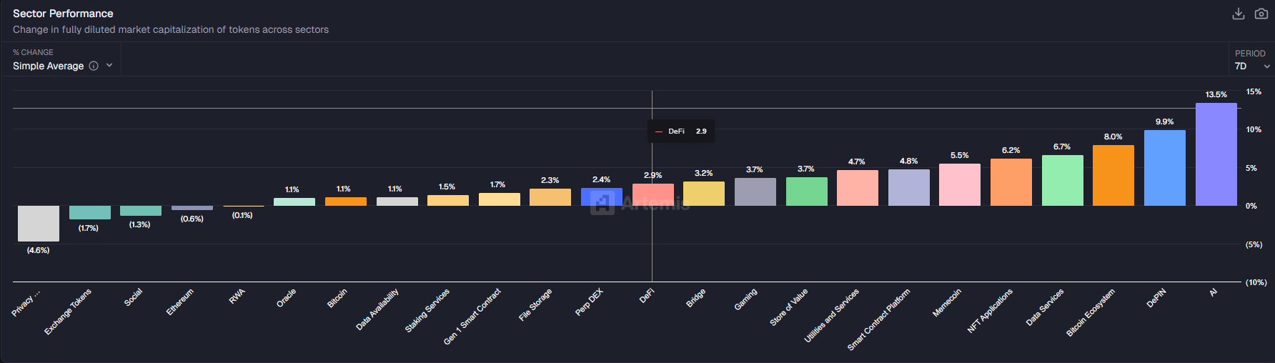 • 板块流量:绝大部分板块实现上涨,AI、Meme 板块领跑市场,隐私代币小幅回调,呈现明显的 “高切低” 轮动特征。