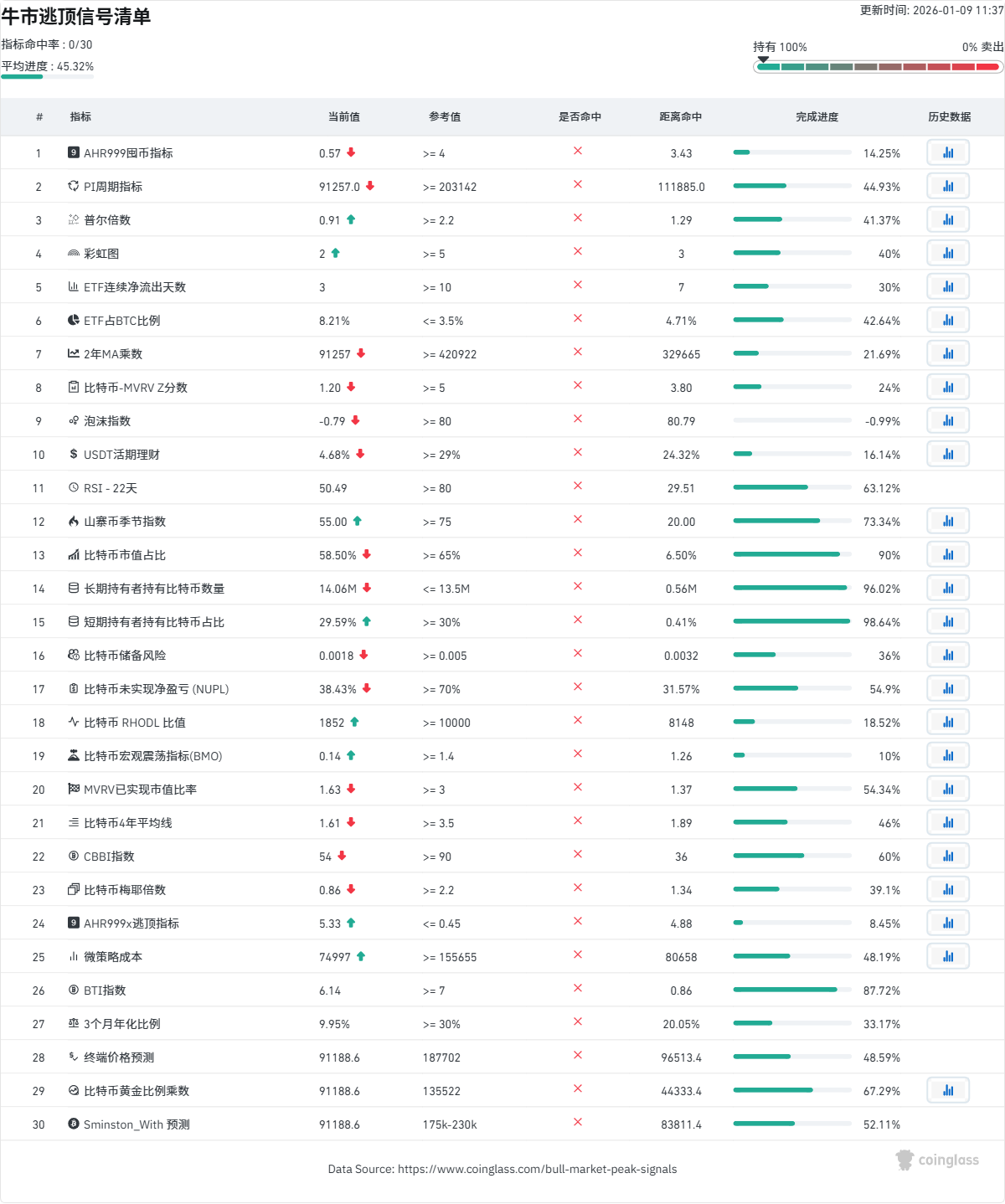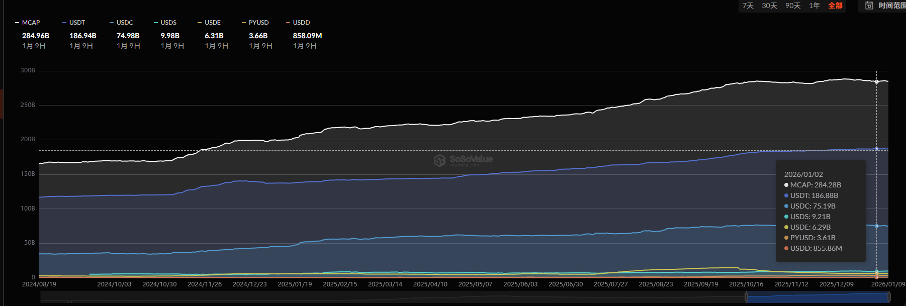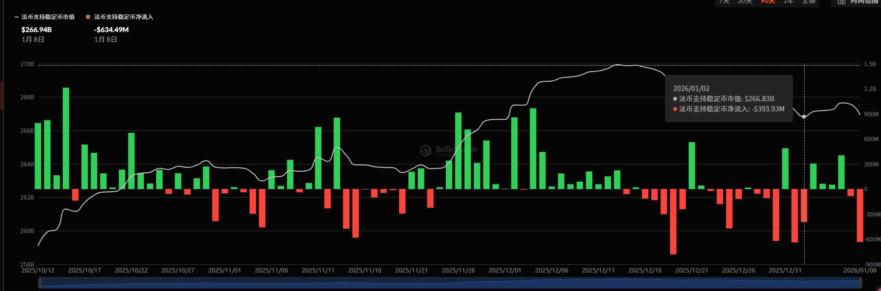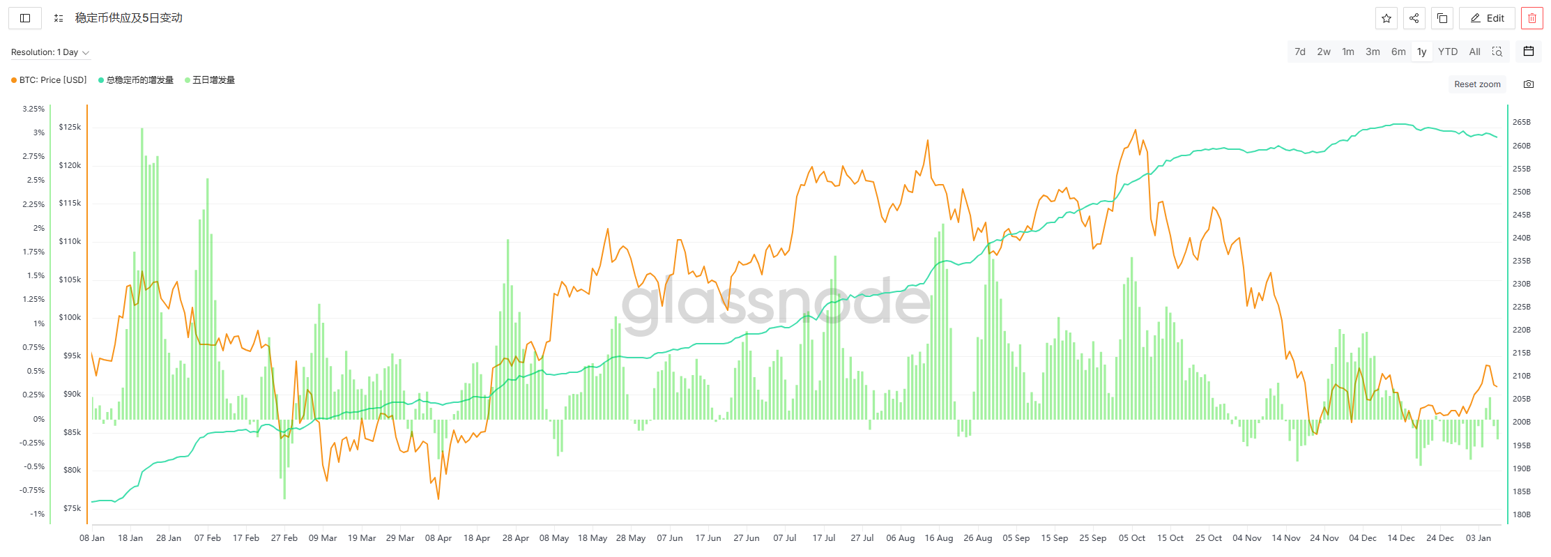 近两周(12/27-1/9)稳定币总市值减少 13.93 亿美元,净流出规模较前一周的 3.26 亿美元有所扩大。尽管 BTC 近期走出反弹行情,但稳定币持续净流出的状态表明,当前上涨更多是技术性修复,尚未形成趋势性反转。后续若稳定币恢复增发,将成为行情延续的重要信号。