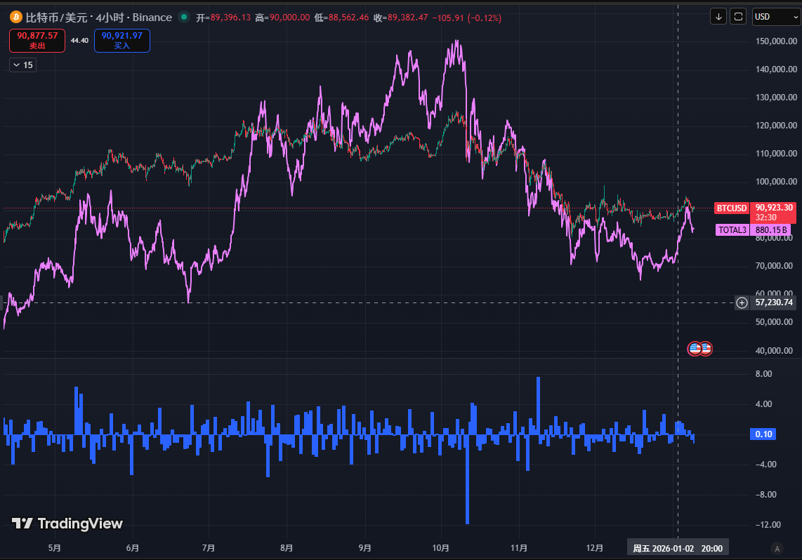 • 市值表现:TOTAL3(除 BTC、ETH 外全代币市值)达 8802 亿美元,环比上涨 7.04%,本周行情冲高回落,新年首周 Meme 板块领涨,高弹性特征点燃市场热情。