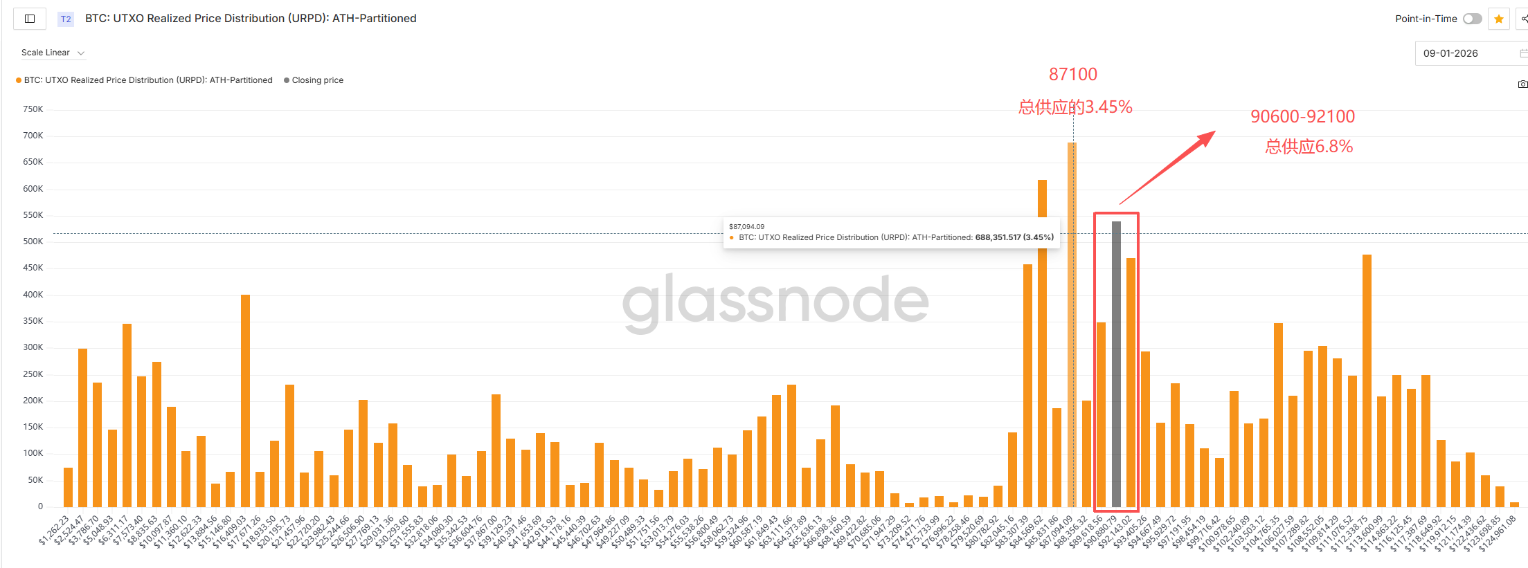 • 筹码分布特征:87100 美元附近筹码积累量达总供应的 3.45%,成为当前最强筹码支撑位,也是 BTC 未能有效跌破该价位的核心原因;同时,89600-92100 美元区间筹码占比增至 6.8%,较此前提升 1.61%,多空换手激烈,行情临近方向选择窗口。