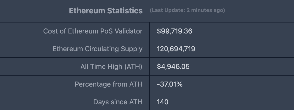 ETHUSD :现价$3,116.79,历史最高价$4,878.26,距最高价跌幅约37.01%