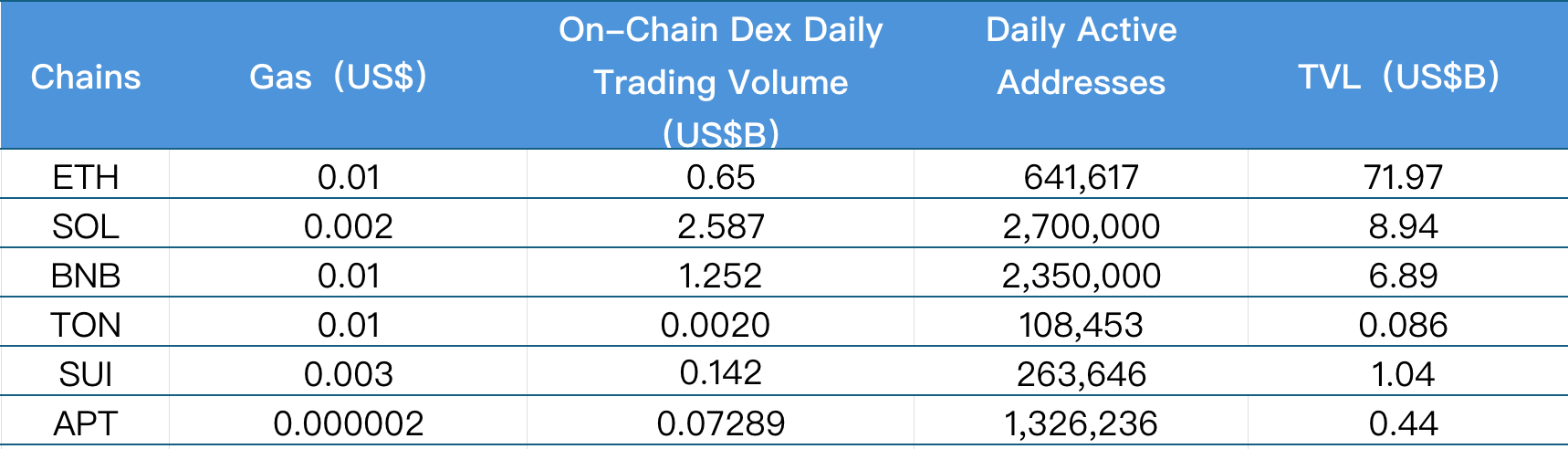 主要从日交易量、日活跃地址、交易费用分析目前主要Layer1含ETH、SOL、BNB、TON、SUI以及APTOS的相关数据。