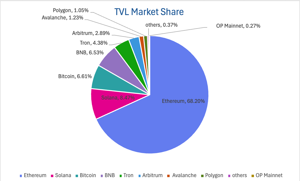 按公链进行划分,其中TVL最高的三条公链分别是Ethereum链,占比68.2%;Solana链,占比8.47%;Bitcoin,占比6.61%。