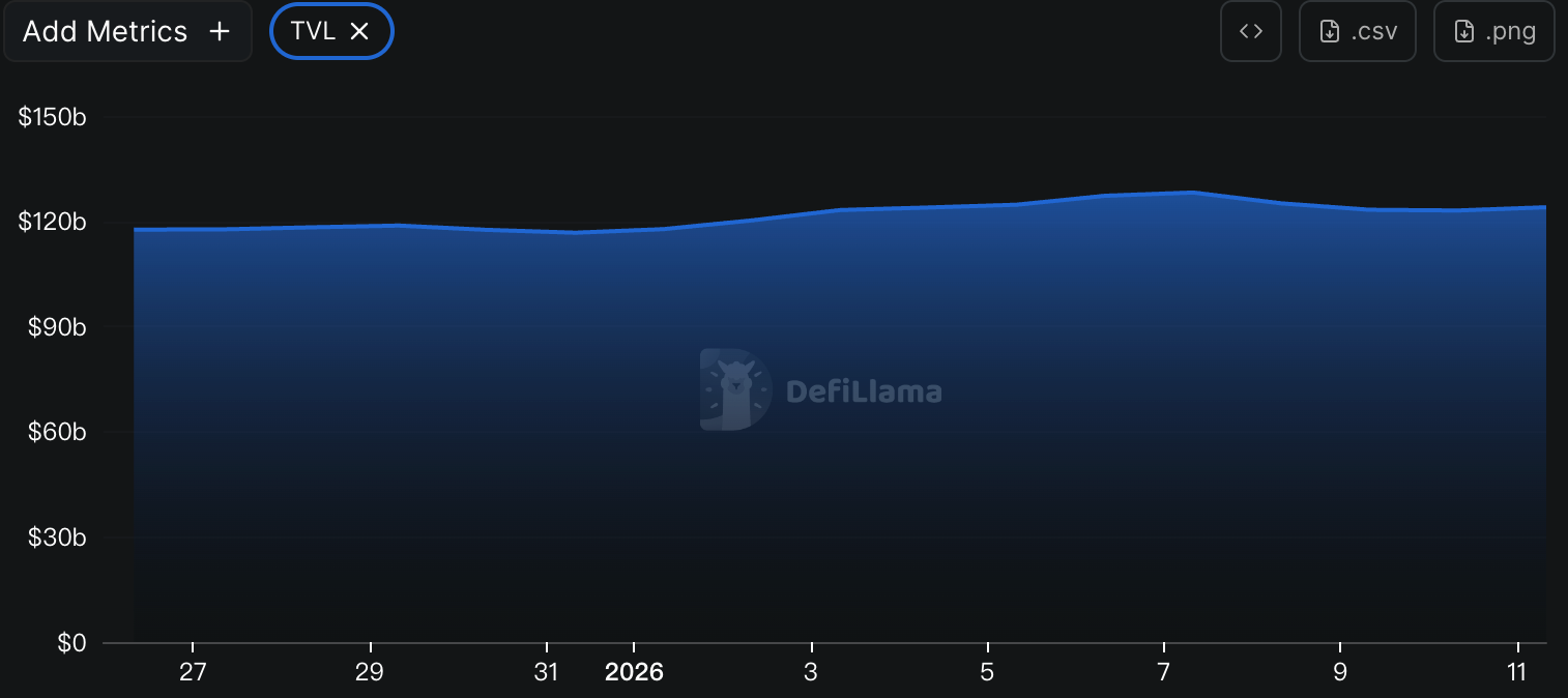 据DeFiLlama的数据,本周DeFi总TVL为$1,239亿,较上周1,243亿,下降约0.32%。