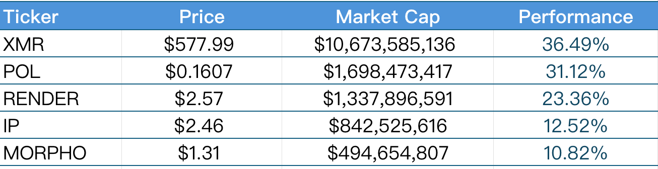 • 涨幅榜:报告列出了过去一周涨幅前五的VC币和Meme币。