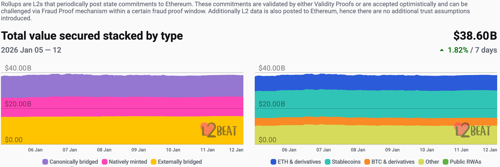 据L2Beat数据显示,以太坊 Layer 2总TVL为386.0亿美元,本周较上周($379.1亿)整体涨幅为1.82%。