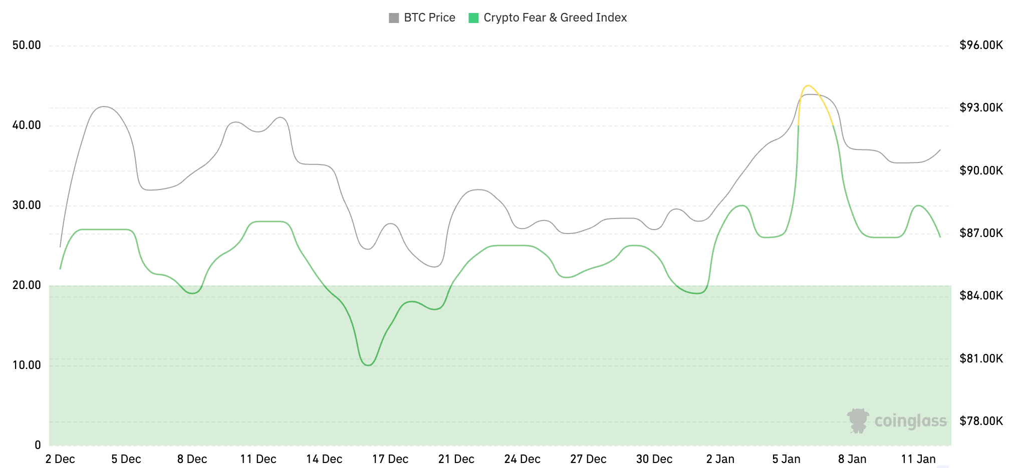 加密货币恐慌指数为26,显示为恐慌。